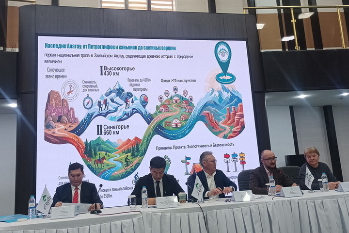 «Наследие Алатау» — от петроглифов и каньонов до снежных вершин. Это первая национальная тропа в Заилийском Алатау, соединяющая древнюю историю с природным величием», — так представлен проект на экране. Сложные тропы для подготовленных и опытных туристов протяженностью 430 километров охватывают высокогорье — ледники и перевалы высотой до 4000 метров. Доступные тропы для начинающих и семей назвали Синегорьем. Их протяженность — 660 километров, они находятся в лесах и в зоне альпийских лугов на высотах до 3500 метров. Устойчивый туризм предусматривает снижение нагрузок с наиболее популярных направлений и развитие новых троп. Их будут отличать легкая инфраструктура, маркировка, указатели, кемпинг-зоны, спасдомики. Система троп охватывают более 70 населенных пунктов, а это значит, что появятся новые рабочие места для местного населения. У него будет возможность сбывать сельхозпродукцию, создавать гостевые дома и ставить юрты для отдыха.